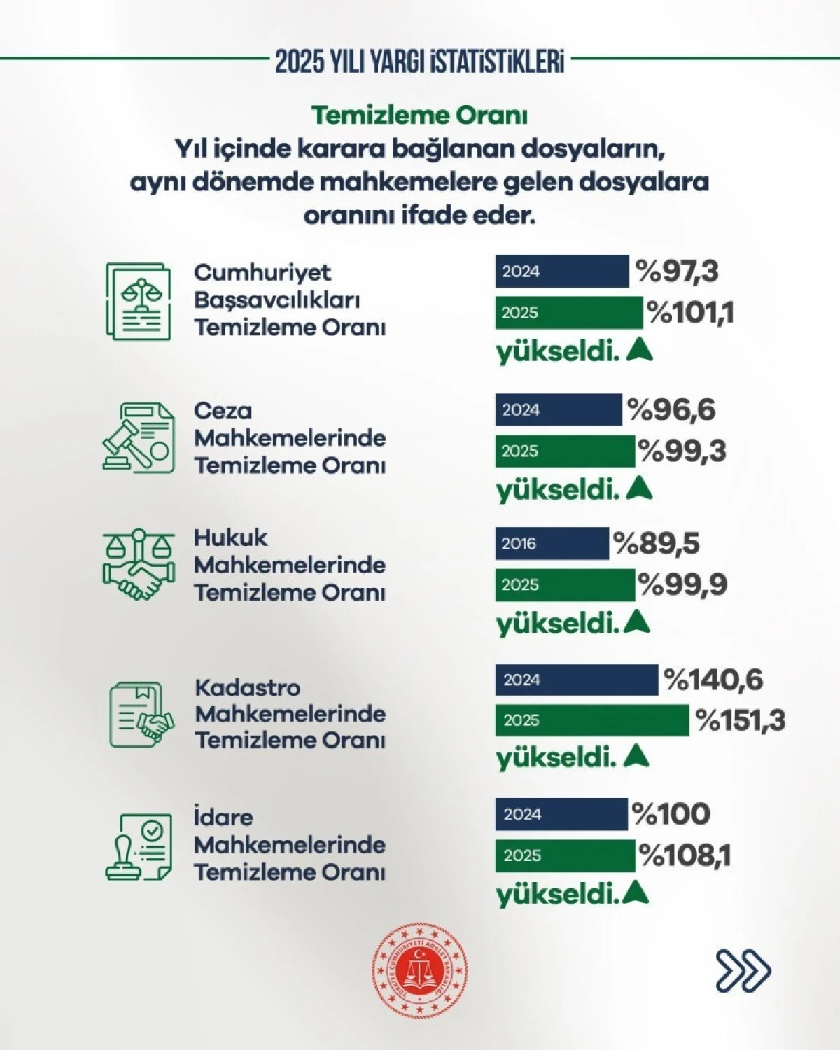 Verilere göre Cumhuriyet Başsavcılıklarında temizleme oranı yüzde 101,1’e ulaşırken, ceza mahkemelerinde 2024’te yüzde 96,6 olan temizleme oranı, 2025 yılında yüzde 99,3 oranına yükseldi.