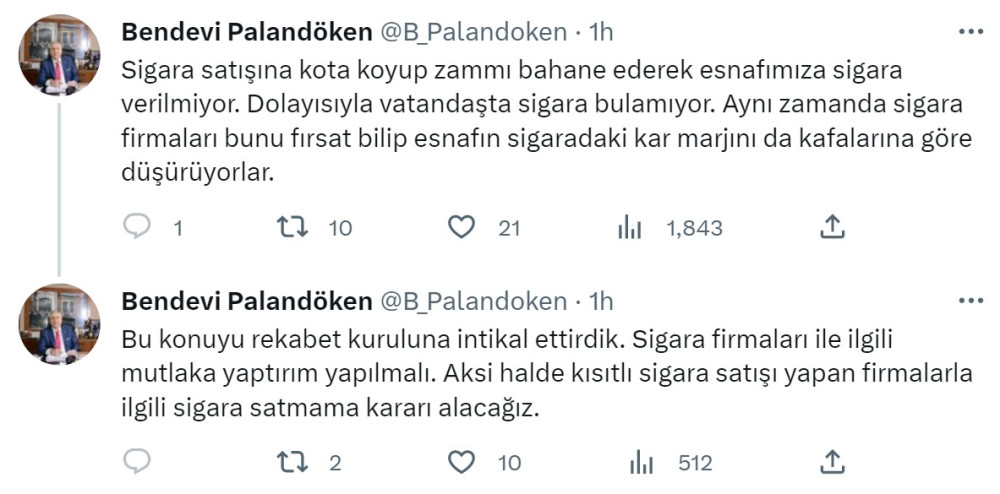Sosyal medya hesabından açıklama yapan Türkiye Esnaf ve Sanatkarlar Odası Başkanı (TESK) Bendevi Palandöken, sigara firmalarına yaptırım çağrısında bulunarak, şunları kaydetti: