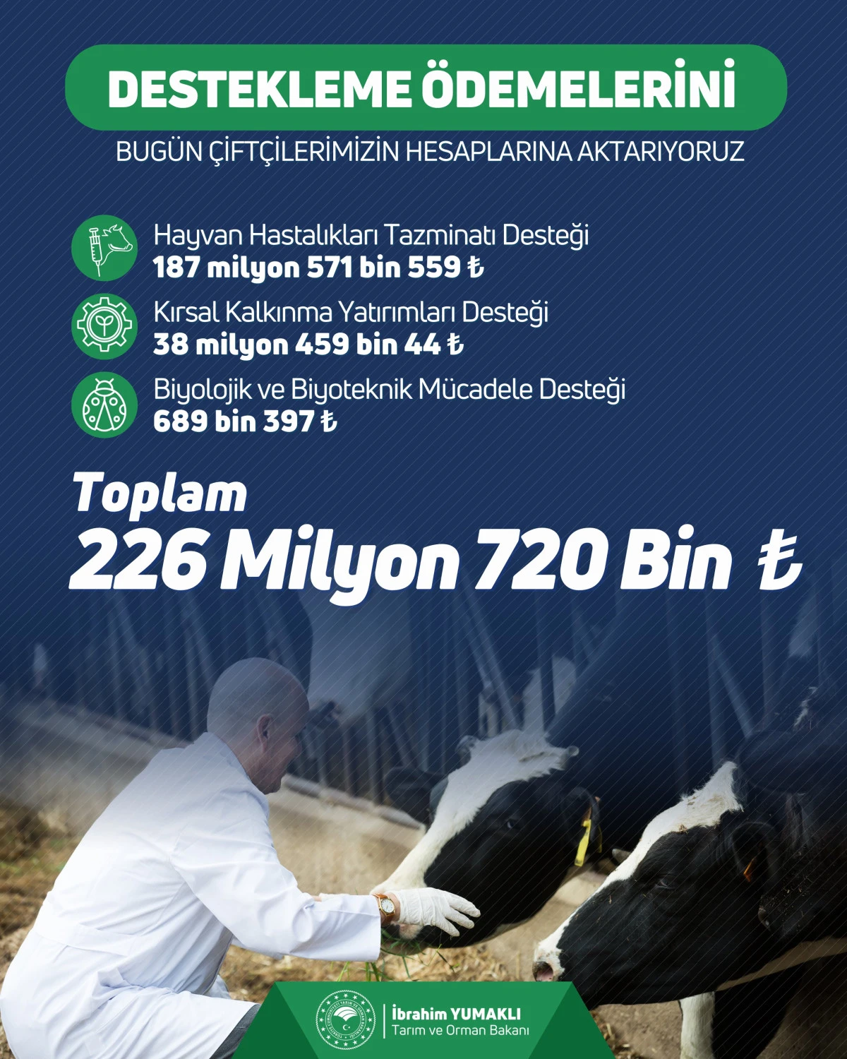 Tarım ve Orman Bakanı İbrahim Yumaklı, üreticilere yönelik toplamda 226 milyon 720 bin liralık tarımsal destekleme ödemesinin bugün itibarıyla çiftçilerin banka hesaplarına geçeceğini duyurdu.
