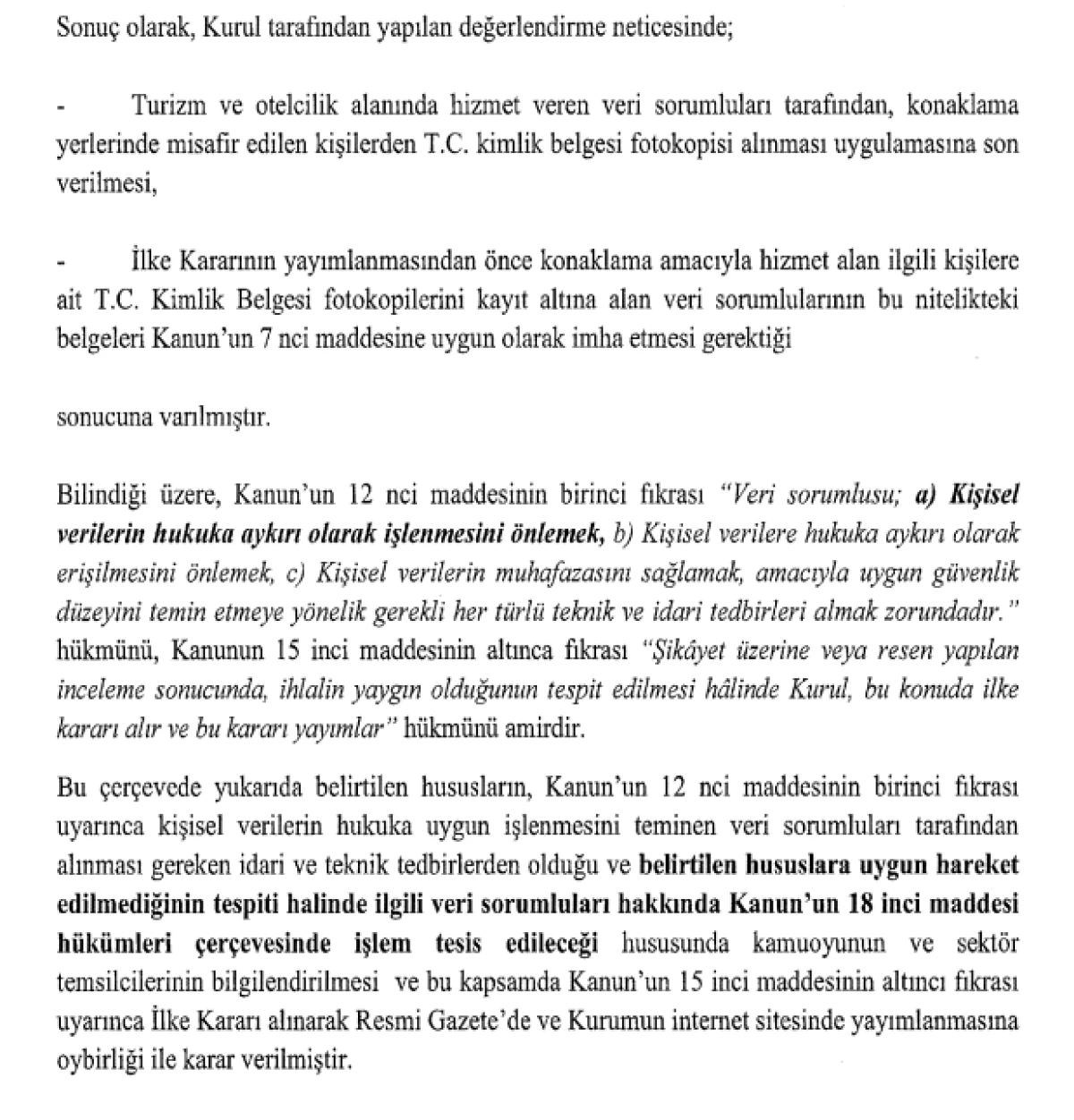 Kişisel Verileri Koruma Kurumu'nun (KVKK ) Resmi Gazete'de yayımlanan kararıyla, konaklama hizmeti veren işletmelerin, gelen müşterilerden T.C. Kimlik Belgesi fotokopisi almasına ilişkin uygulama sona erdi.